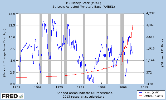 Monetary base against M2 (y-o-y). The base which the Federal Reserve has direct control over, has had virtually ZERO correlation with M2: