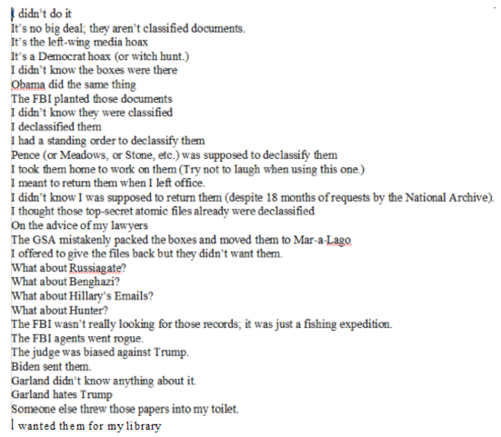 So when the FBI discovered Trump had stolen dozens of classified documents belonging not to him but to the government, he immediately produced dozens of lies and excuses.