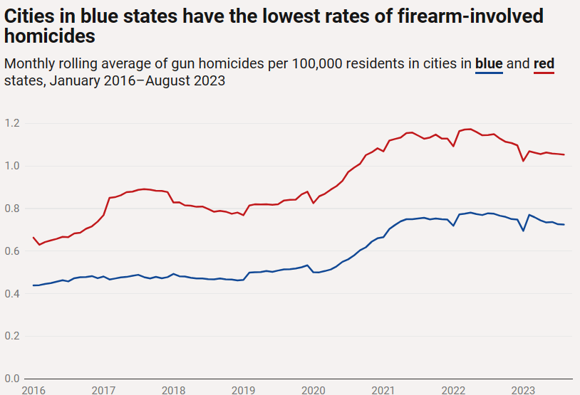 From 2015 to 2022, cities in blues states saw an average gun homicide rate of 7.23 per 100,000 residents. In red-states cities, that rate was 11.1 per 100,000 residents—53 percent higher than the rate in blue-state cities.
