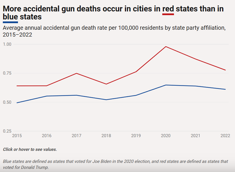 In 2022, for example, cities in red states experienced 27 percent more accidental shootings, on average, than cities in blue states. These data suggest that the difference between these cities is not just a crime problem; it’s a gun problem.
