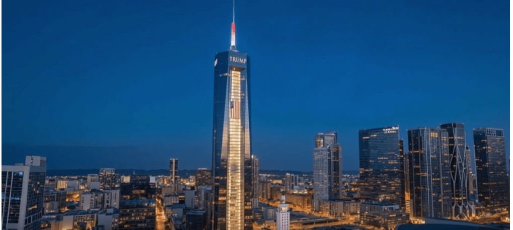 A red-white-and-blue spire juts out skyward from the top of the building, above Trump’s name. The video also shows a massive American flag hanging down from the center of the tower.