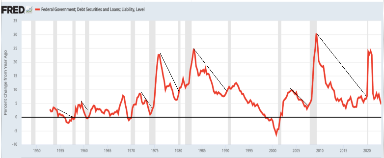 The red line demonstrates changes in federal deficits. The vertical gray bars are official recessions. The slanted lines show declining deficits leading to recessions, which then are cured by increased deficits.