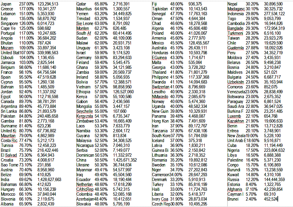 Skim the following list of Debt/GDP ratios, and see if you can find any relationship between the Debt/GDP ratio, the population of the nation, and what you know about the health of its economy.