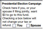 For instance, when you or your accountant filed your tax return, did you notice this little box? You, having a reasonable command of English, may think this means there is something called a “Presidential Election Campaign” fund, and by checking the box(es) you are directing the government to send $3 to this fund.