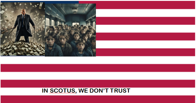 The phrase “IN SCOTUS, WE DON’T TRUST” reflects the U.S. Supreme Court’s claims to be “originalist.” Sadly, this Court has established a Presidency that operates above the law—the exact opposite of what the Constitution’s original framers intended and what the Revolutionary War was fought to end.