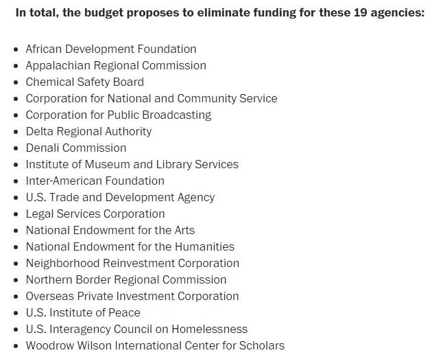 Among the agencies that would be zeroed out are the Corporation for Public Broadcasting (which got $445 million last year), the Appalachian Regional Commission ($146 million), the National Endowment for the Arts ($148 million) and the National Endowment for the Humanities ($148 million).
